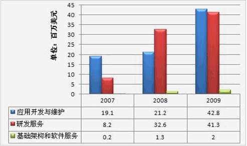 中國IT服務(wù)企業(yè)承擔(dān)的離岸IT服務(wù)項(xiàng)目主要是軟件外包。這些業(yè)務(wù)包括應(yīng)用程序開發(fā)和管理、產(chǎn)品開發(fā)、包裝解決方案服務(wù)、全球化和本地化服務(wù)等。這些客戶包括外國公司和外國公司在中國的分支機(jī)構(gòu)/子公司。中國的離岸軟件外包市場近年來也發(fā)展迅速。根據(jù)IDC 2010年7月的報(bào)告,中國離岸軟件市場規(guī)模將從2009年的28億美元增長到2014年的76億美元,年復(fù)合增長率為22.4%。